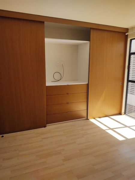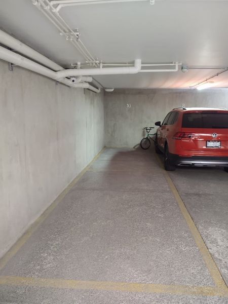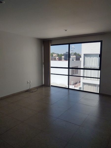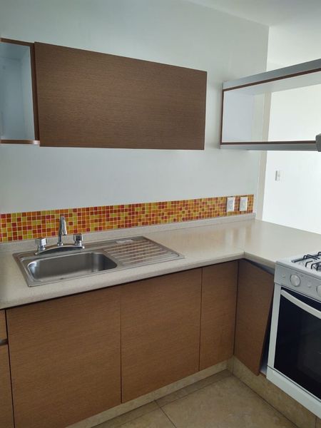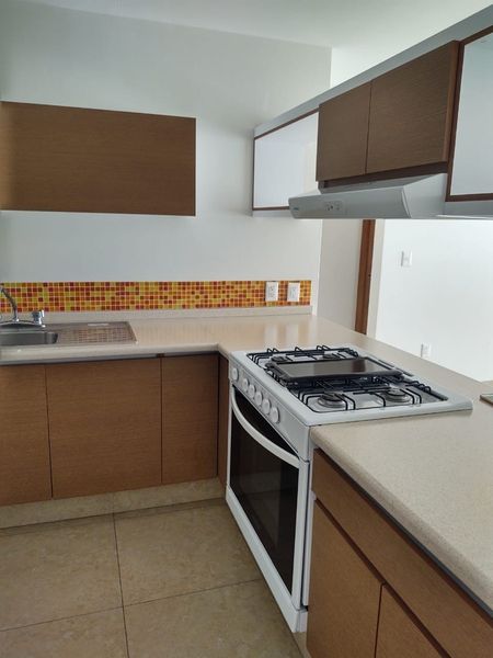 Consta de estancia para sala comedor, cocina integral, área de lavado integrada al departamento, dos recámaras y dos baños completos, estacionamiento para dos autos con portero automático.