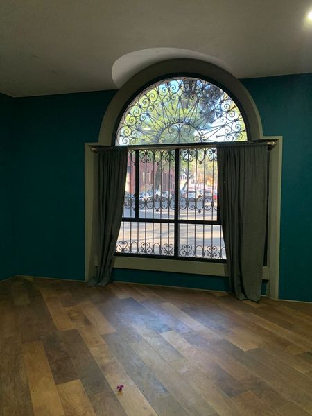 En planta baja, tiene amplia estancia, iluminada con el bello ventanal de la fachada, una cocina clásica con techo de doble altura, cubierta con Talavera y anaqueles de madera, un medio baño en la entrada y una escalera abierta hacia el primer piso.